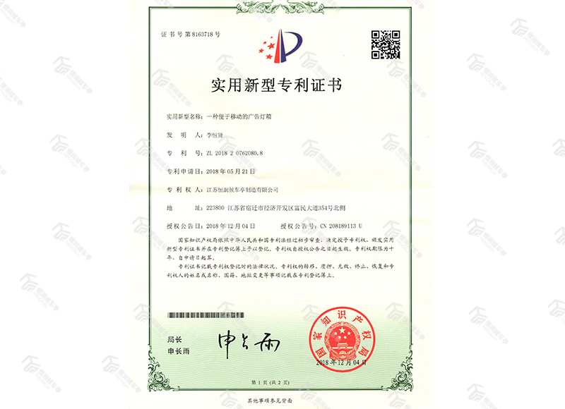 一种便于移动的广告灯箱实用新型专利证书