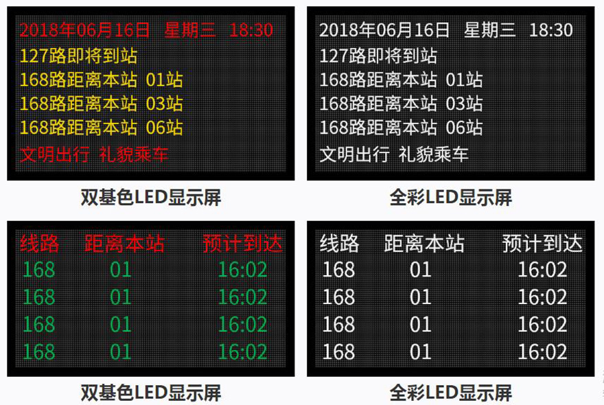 采用户外工业级LED显示屏,支持双基色全彩显示,可远程发布时间、公告、车辆预报站信息,尺寸及显示样式可定制化设计。
